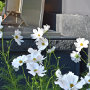 Die luftigen Blüten der Cosmeen bilden einen schönen Kontrast zu dem harten und sehr schön bearbeiteten Granit. Die senkrechte Granitwand dient als Böschungsbefestigung. Senkrechte Granitwand und Arbeitsplatte stammen aus dem selben Steinbruch. Die Oberflächenbearbeitung beider Granitplatten wurde aufeinander abgestimmt.