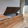 In den Aufbewahrungsboxen aus Holz findet sich jede Menge Stauraum für wasserfeste Gartenutensilien. Eine Gasdruckfeder erleichtert das Öffnen und verhindert Verletzungen beim Schließen.
