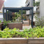 Der Blick über den Gemüsegarten mit Hochbeeten zur Holzterrasse und zur Pergola