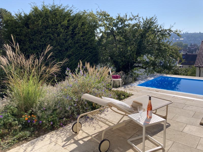 Eine solche Spezialanlage musste vom Baurechtsamt genehmigt werden, was sie auch schließlich wurde. In der Zwischenzeit zieht der Bauherr morgens seine Bahnen im beheizbaren Pool, die Kinder haben im Sommer ihr Vergnügen und auf der Terrasse fand schon die ein und andere gemütliche Runde mit Freunden bei einem guten Glas Wein statt.