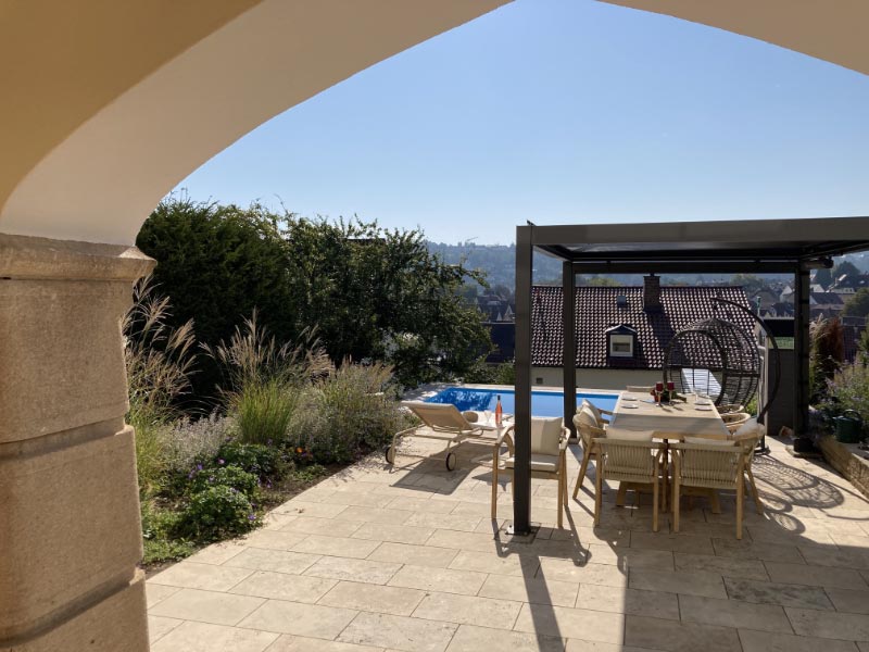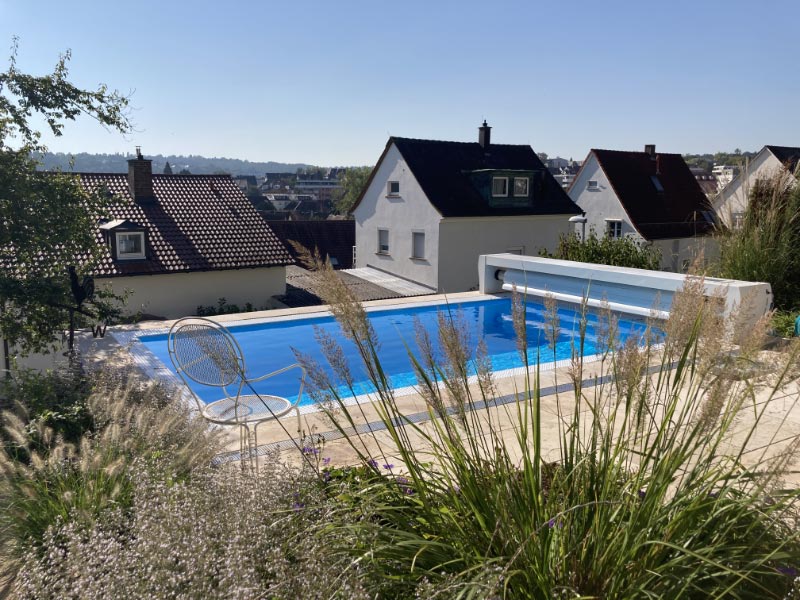 Wer Stuttgart kennt, der weiß, das Grundstücke und Gärten oftmals am Hang liegen. Bei diesem großen Grunstück in Stuttgarter Halbhöhenlage sollte eine große Terrasse und ein Pool entstehen. Und damit man in der Südlage auch ein Schattenplätzchen hat, sollte eine Überdachung eingeplant werden, bei der die Lamellen auf und geschlossen werden können. Eine besondere Herausforderung bestand darin, dass sich unter dem Gelände noch eine Tiefgarage befindet, was natürliche angesichts des Poolgewichtes eine besondere Herausforderung war.