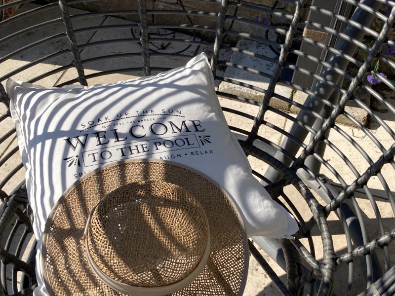 Unter der Überdachung kann man seinen Blick über den Pool und den Gegenhang schweifen lassen