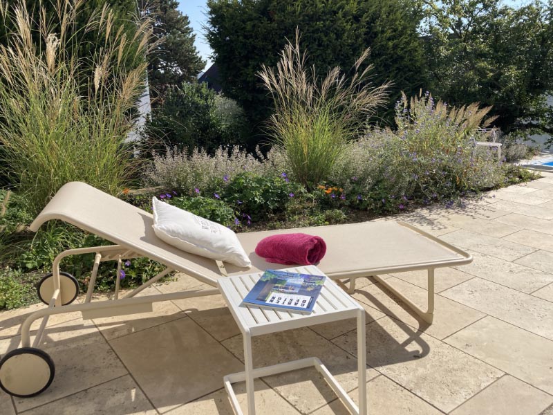 Beim Anblick der Sonnenliege mit dem Gräserbeet kommt Entspannung auf