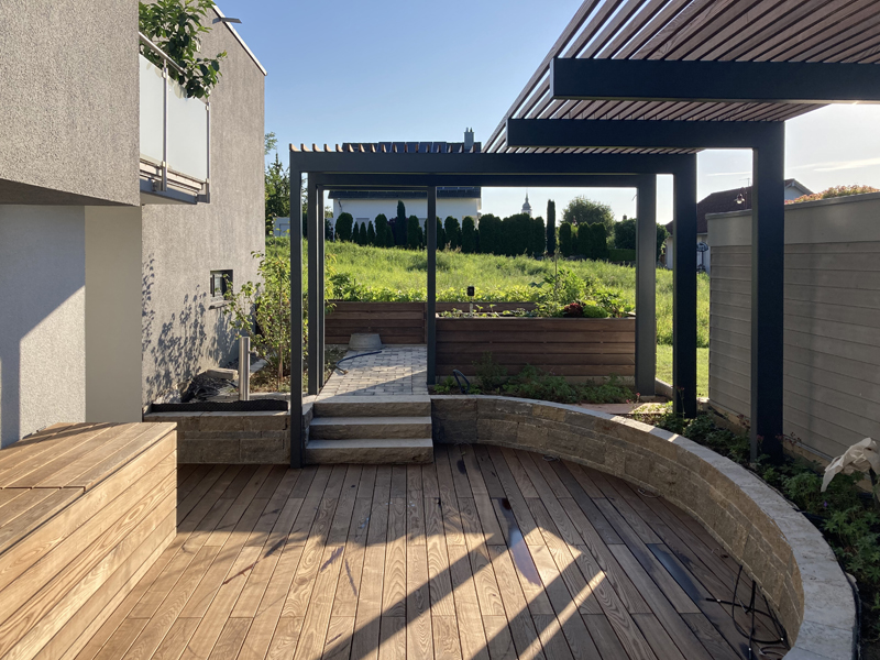 An der überwältigenden architektonischen Wirkung der Pergola und der Holzterrasse konnten wir uns gar nicht sattsehen, insbesondere da die Schattenwirkung sich mit dem Sonnenstand stets verändert.